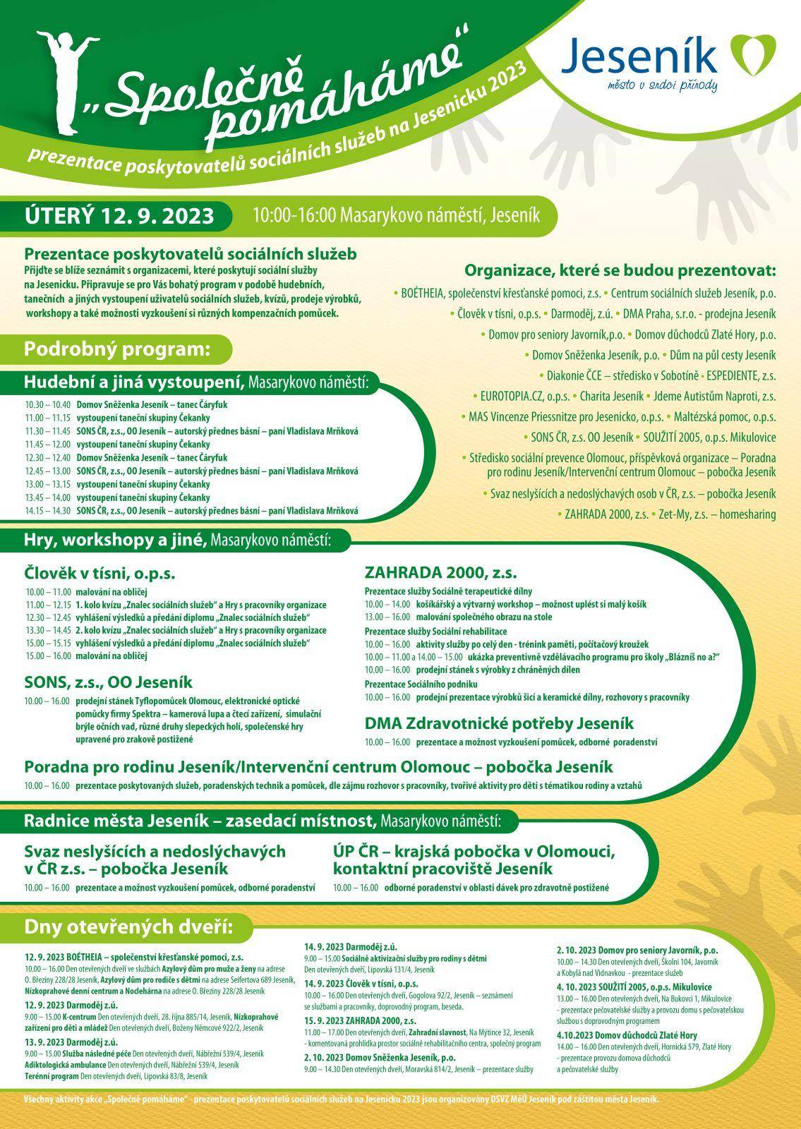 Již pošesté se v Jeseníku představí regionální poskytovatelé sociálních služeb. Akce „Společně pomáháme“ se uskuteční v úterý 12. 9. 2023 od 10.00 do 16.00 na Masarykově náměstí v Jeseníku. A také letos je navázána na celorepublikovou kampaň Týden sociálních služeb ČR…