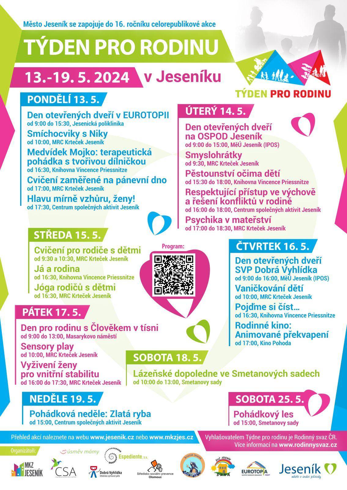 Pestrou škálu aktivit pro všechny si ve spolupráci s městem připravily například Městská kulturní zařízení Jeseník a další místní neziskové organizace jako Poradna pro rodinu, Mateřské a rodinné centrum Krteček, EurotopiaCZ, Espediente a další.Podrobný program naleznete v letáku v příloze nebo na webu MKZ Jeseník.