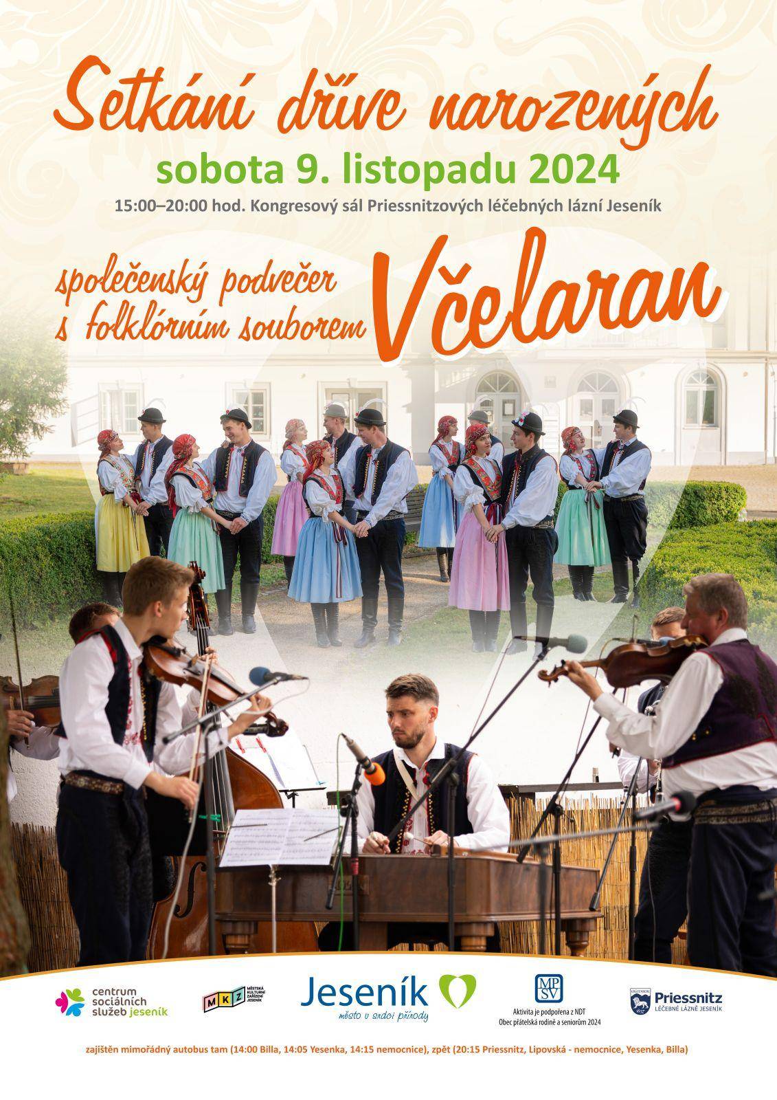 Město Jeseník vás srdečně zve na společenskou událost „Setkání dříve narozených“ která proběhne v sobotu 9. listopadu od 15:00 do 20:00 v Kongresovém sále Priessnitzových léčebných lázní Jeseník. Čeká vás příjemný podvečer s folklórním souborem Včelaran. Doprava je zajištěna mimořádným autobusem, který odjíždí ve 14:00 od Billy, ve 14:05 od Yesenky a ve 14:15 od nemocnice, zpět pak vyjíždí ve 20:15 od Priessnitzových lázní. Událost je pořádána ve spolupráci s Centrem sociálních služeb Jeseník, Městskými kulturními zařízeními Jeseník a Priessnitzovými léčebnými lázněmi a. s. Spolufinancována je z NDT Obec přátelská rodině a seniorům 2024.