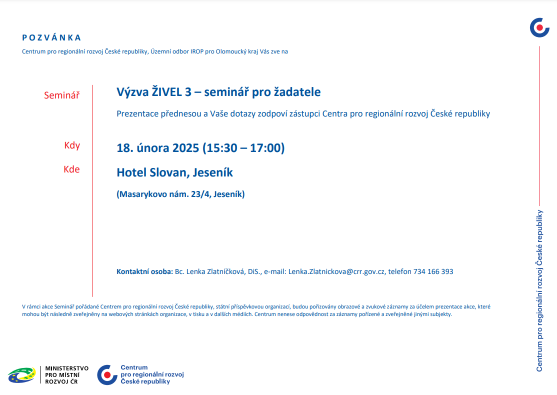 Účast na senináři je nutné potvrdit nejpozději do 14. února 2025 do 23:59 hodin přes registrační formulář: https://crr.gov.cz/kalendar/zivel-3-seminar-pro-zadatele/