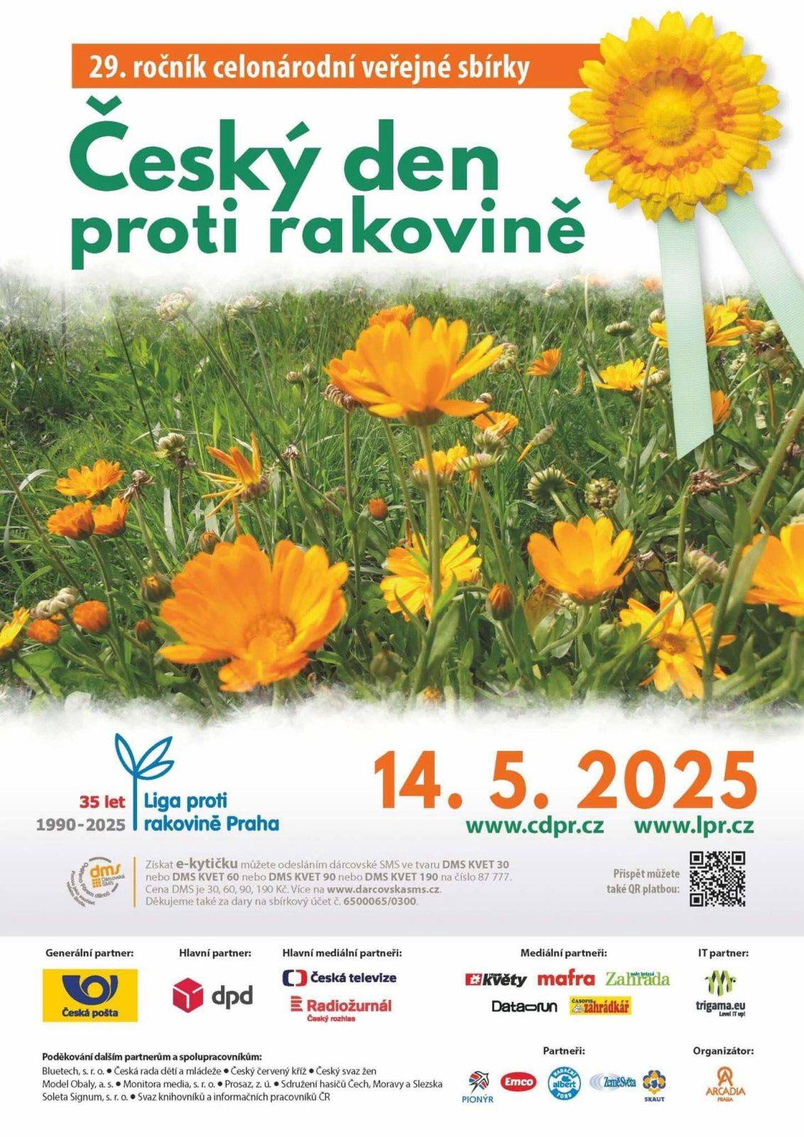 Tradiční veřejná sbírka Český den proti rakovině 2025, kterou již po 29. pořádá Liga proti rakovině Praha, se uskuteční ve středu 14. května 2025, přičemž na vybraných pevných místech bude možné kytičky získat až do neděle 18. května. Symbolickou kytičku měsíčku lékařského se světle zelenou stužkou si můžete pořídit za minimální příspěvek 20 Kč. Letošní ročník se zaměřuje na prevenci kolorektálního karcinomu a podporu screeningových programů. Výtěžek sbírky pomůže financovat prevenci, výzkum i péči o onkologické pacienty. Více informací naleznete na www.cdpr.cz.