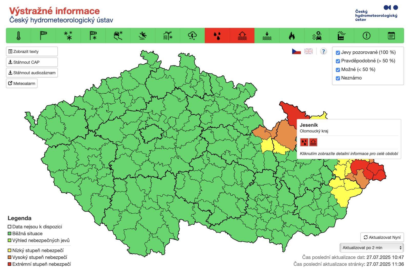 Do dnešních 18.00 hodin (27. července) platí pro okres Jeseník výstraha před extrémními srážkami. Více na webu ČHMÚ v sekci výstražné informace. Situaci monitorujeme a sledujeme vývoj spadlých srážek na měřících stanicích. Na základě předpovědi ČHMÚ jsou zaměstnanci Odboru životního prostředí a Oddělení vnitřní správy MěÚ Jeseník v pohotovosti, aby mohli na změnu ve vývoji situace pružně reagovat. Ve spojení jsme také s HZS Olomouckého kraje. V případě potřeby bude starostkou města Jeseník svolána také povodňová komise ORP Jeseník.