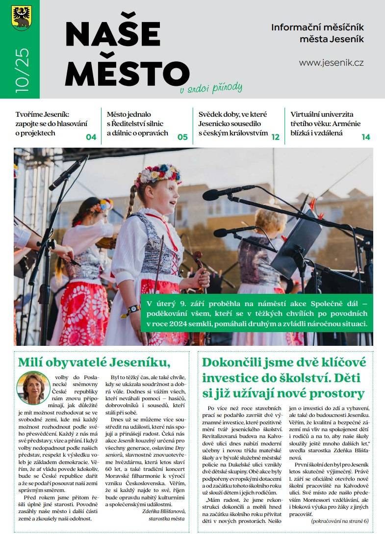 Vyšlo říjnové číslo zpravodaje Naše město. Zpravodaj je dostupný v elektronické verzi na jesenik.cz/nasemesto nebo v aplikaci Hlášení rozhlasu/Úřad v mobilu. V tištěné verzi již nyní ve vašich schránkách.
