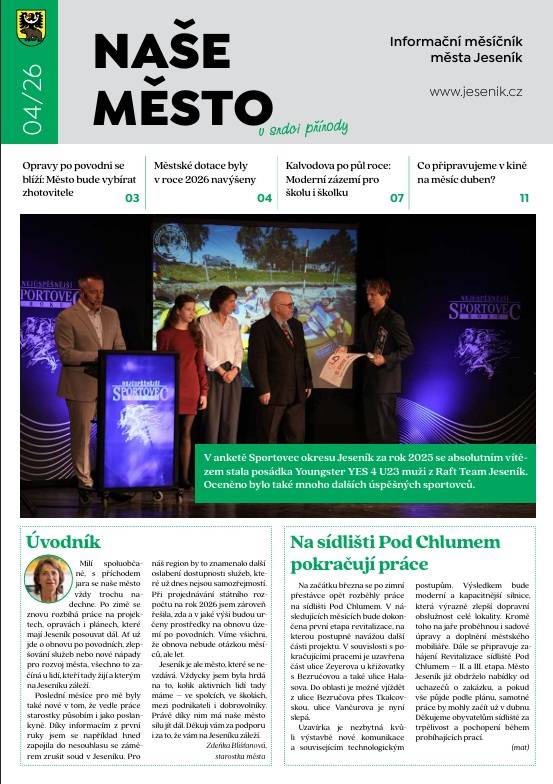 Vyšlo dubnové číslo zpravodaje Naše město. Zpravodaj je dostupný v elektronické verzi na jesenik.cz/nasemesto nebo v aplikaci Hlášení rozhlasu/Úřad v mobilu. V tištěné verzi ve vašich schránkách.