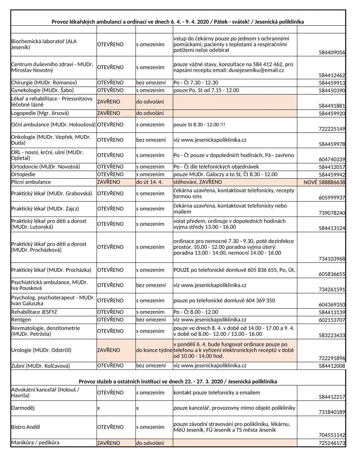 JESENICKÁ POLIKLINIKA - PROVOZ 6.-9.4.2020 06.04.2020V příloze článku naleznete nový přehled provozu Jesenické polikliniky 6.-9.4.2020. Další fotografie