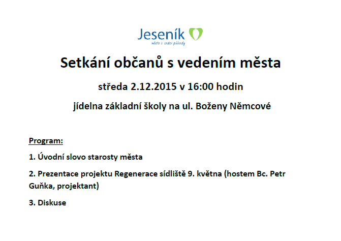 SETKÁNÍ S OBČANY 2.12.2015 24.11.2015Setkání občanů s vedením města proběhne ve středu 2.12.2015 v 16:00 hod v jídelně ZŠ na ul. Boženy Němcové Program: 1. Úvodní slovo starosty města 2. Prezentace projektu Regenerace sídliště 9. května (hostem Bc. Petr Guňka, projektant) 3. Diskuse