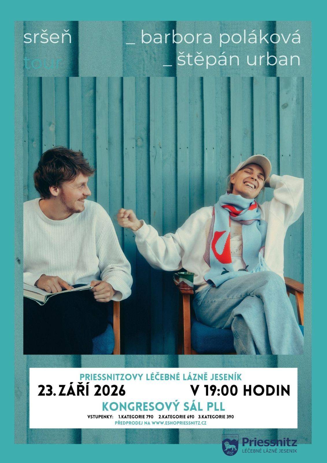 BÁRA POLÁKOVÁ a ŠTĚPÁN URBAN, sršeň tour 2026 23.09.2026 od 19:00 do 21:00 hod. Priessnitzovy léčebné lázně a.s., Kongresový sál, Jeseník | Mapa První společné koncertní turné Barbory Polákové a Štěpána Urbana. Koncerty, při kterých se můžete zaposlouchat do jemných melodií a niterných textů. Jejich první společné album "Sršeň" splňuje vše, co od moderního folk-popu očekáváte.Délka koncertu: cca 70 minut, bez přestávky (čas konce je orientační) Vstupenky: 1.kategorie 790 Kč 2.kategorie 690 Kč 3.kategorie 390 Kč VSTUPENKY: https://goout.net/cs/listky/koncertni-turne-srsen-barbora-polakova-and-stepan-urban/aunjb/ | |