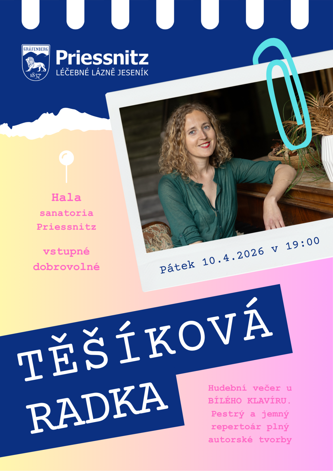 SETKÁNÍ U BÍLÉHO KLAVÍRU 10.04.2026 od 19:00 do 20:00 hod. Priessnitzovy léčebné lázně a.s., Hala lázeňského domu Priessnitz, Jeseník | Mapa Přijměte pozvání na setkání se zpěvačkou, klavíristkou, autorkou písní a violoncellistkou Radkou Těšíkovou. Vstupné dobrovolné | |