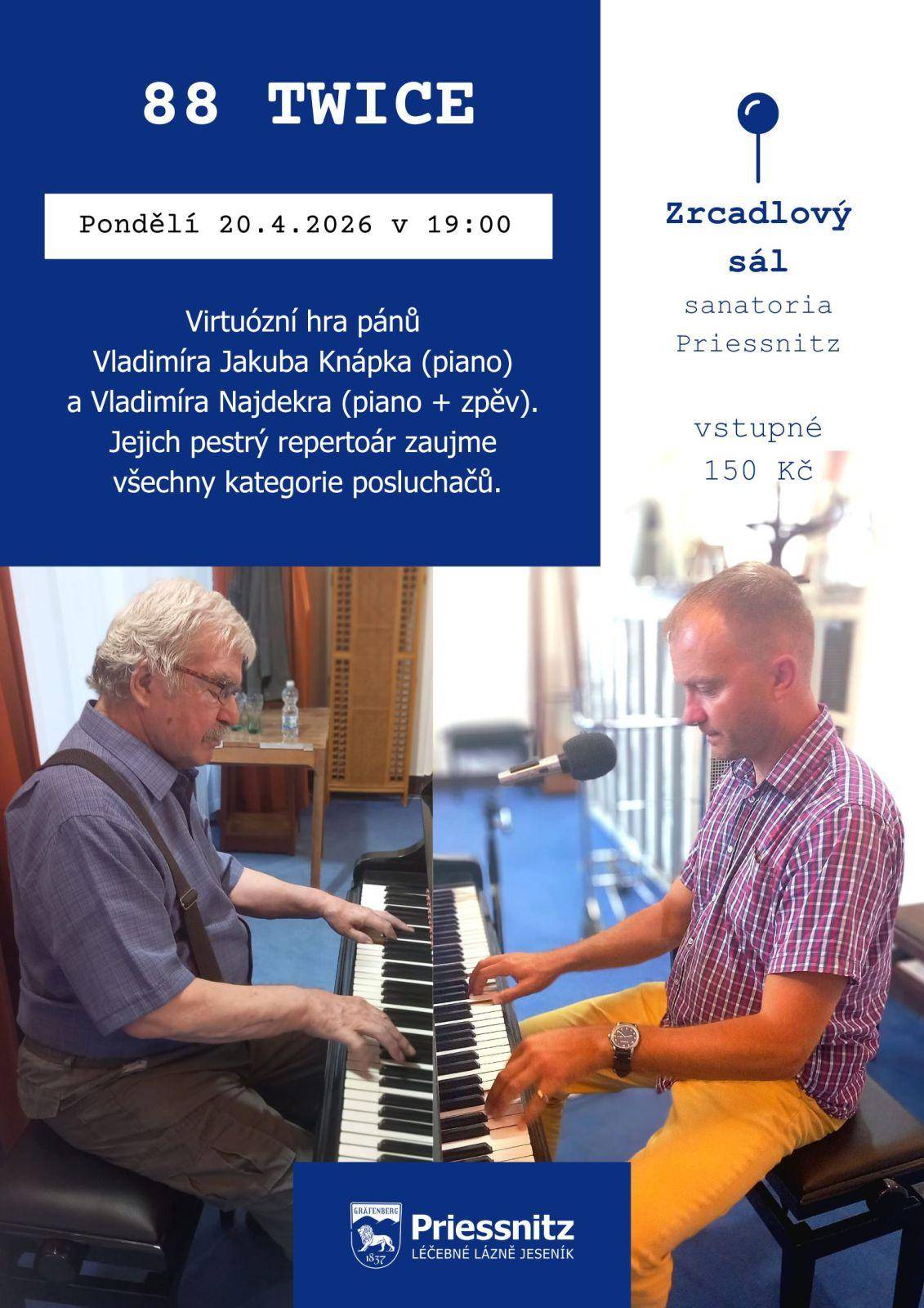 KONCERT 88TWICE 20.04.2026 od 19:00 do 20:00 hod. Priessnitzovy léčebné lázně a.s., Zrcadlový sál, Jeseník | Mapa Dvě piana, dva muži a krásné (nejen) jazzové melodie. Vstupné 150 Kč. | |