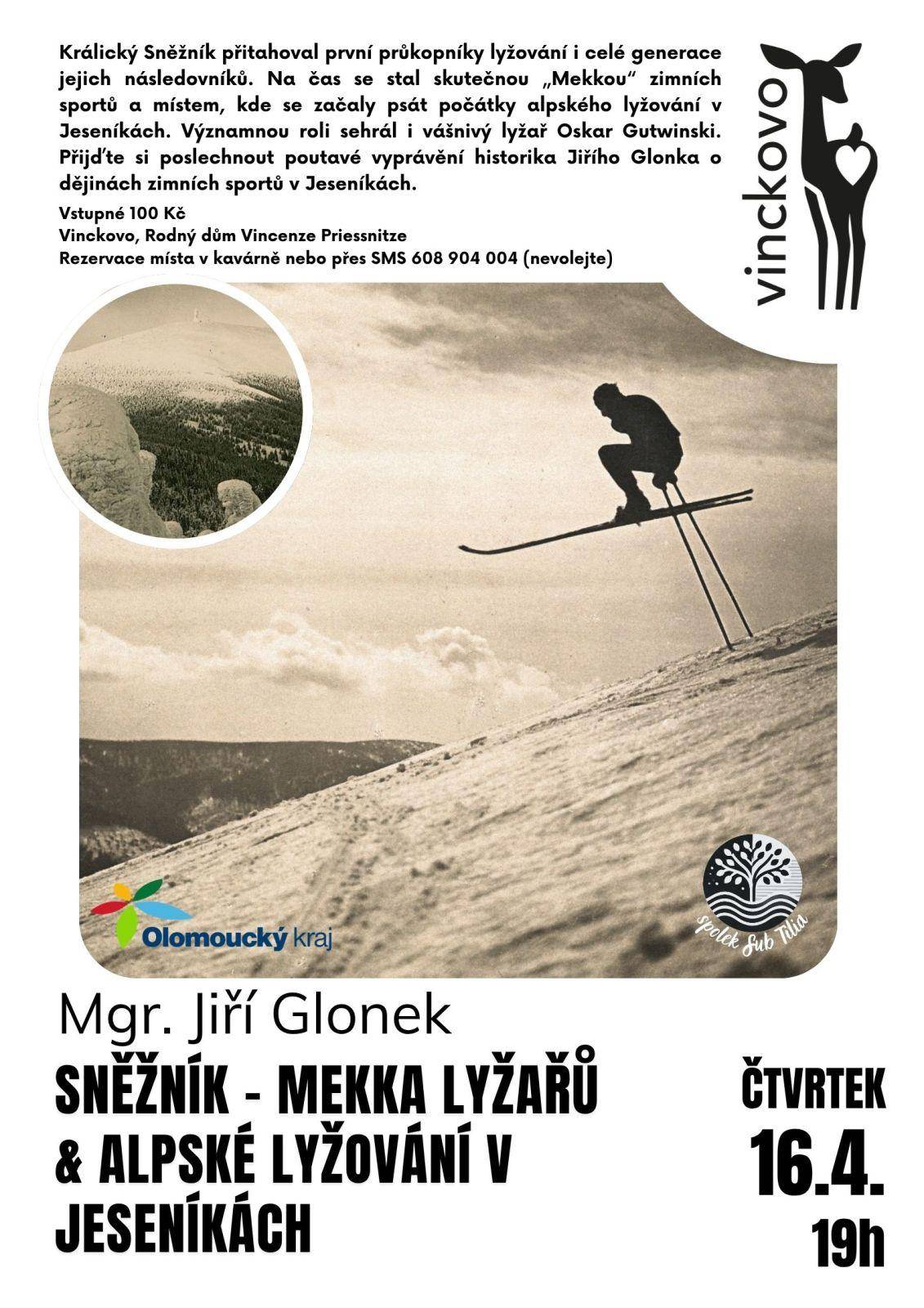 Mgr. Jiří Glonek: SNĚŽNÍK – MEKKA LYŽAŘŮ & ALPSKÉ LYŽOVÁNÍ V JESENÍKÁCH 16.04.2026 od 19:00 do 21:00 hod. Vinckovo kafe, Jeseník | Mapa Právě zde se začaly psát počátky alpského lyžování v celé Jesenické oblasti. Velkou zásluhu měl také vášnivý skiják a chatař – legendární Oskar Gutwinski. Vstupné 100 Kč. | |