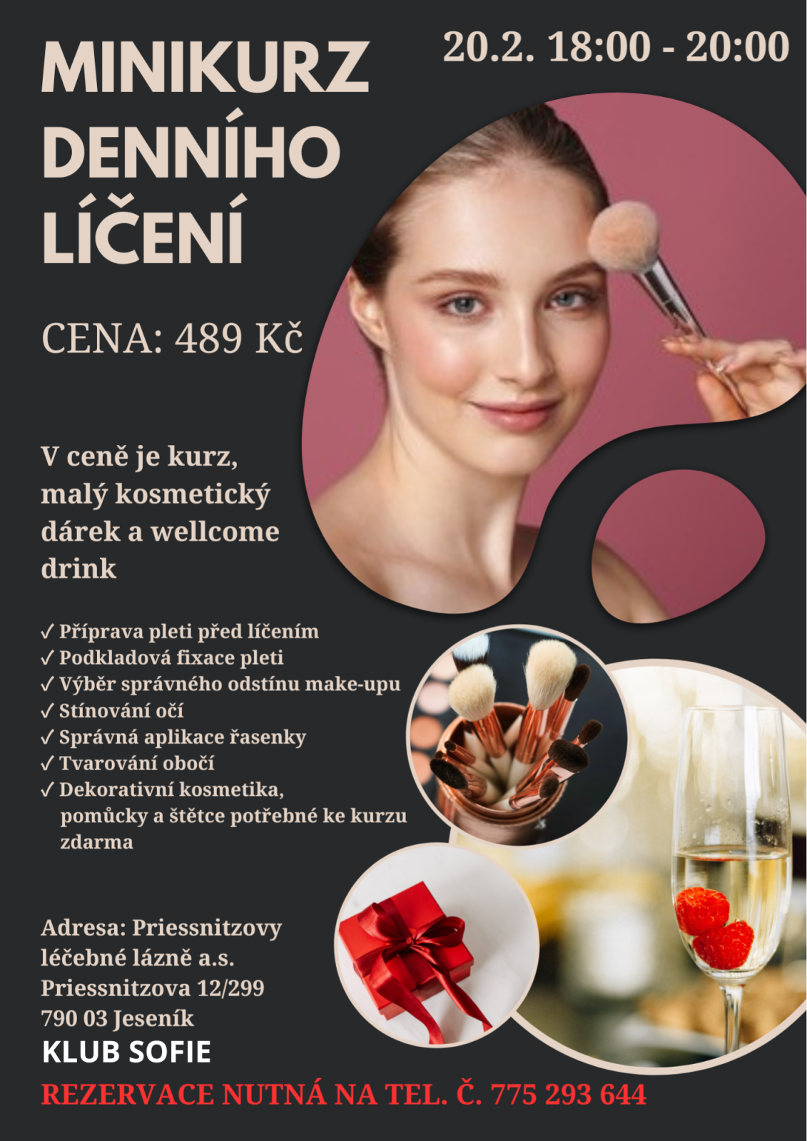 MINIKURZ DENNÍHO LÍČENÍ 20.02.2026 od 18:00 do 20:00 hod. Klub SOFIE, Jeseník | Mapa Dopřejte si večer jen pro sebe a naučte se, jak podtrhnout svou přirozenou krásu. Na minikurzu denního léčení vás zkušená lektorka provede základy správné péče o pleť, výběru vhodných odstínů a technik, které využijete každý den. Čeká vás praktická ukázka, tipy na jednoduché a elegantní líčení i prostor pro vaše dotazy. Cena 489 Kč. V ceně kurzu je wellcome drink a malý kosmetický dárek. Rezervace na tel. č. 775 293 644 | |
