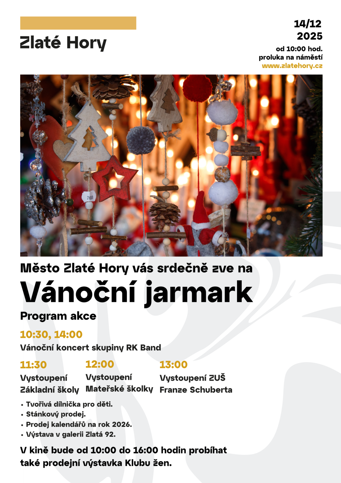 VÁNOČNÍ JARMARK ZLATÉ HORY 14.12.2025 od 10:00 do 18:00 hod. nám. Svobody Zlaté Hory, Zlaté Hory | Mapa Vystoupení ZŠ, MŠ a ZUŠ Franze Schuberta Zlaté Hory. | |
