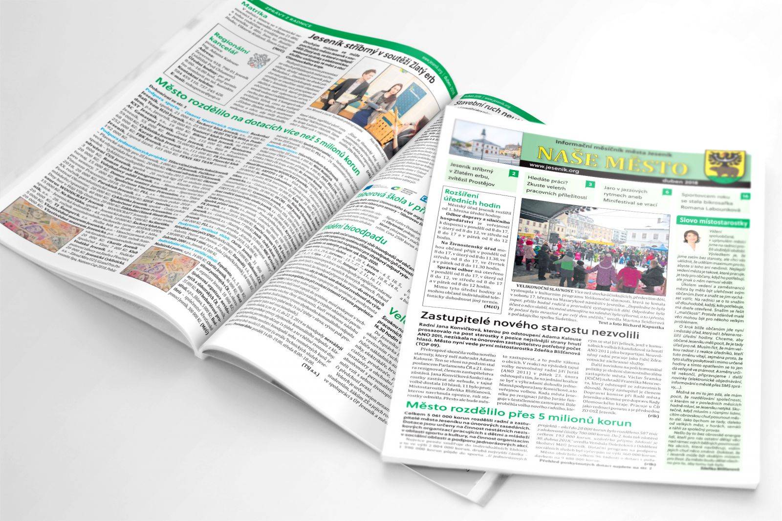 Informační měsíčník města Jeseník přináší aktuální informace o chodu města, městského úřadu, základní školy, základní umělecké školy, mateřských škol, ale také z oblasti kultury a sportu, kalendář kulturních a společenských akcí. Vaše příspěvky do Našeho města zasílejte na adresu: nasemesto@jesenik.cz. Archiv měsíčníku naleznete zde.