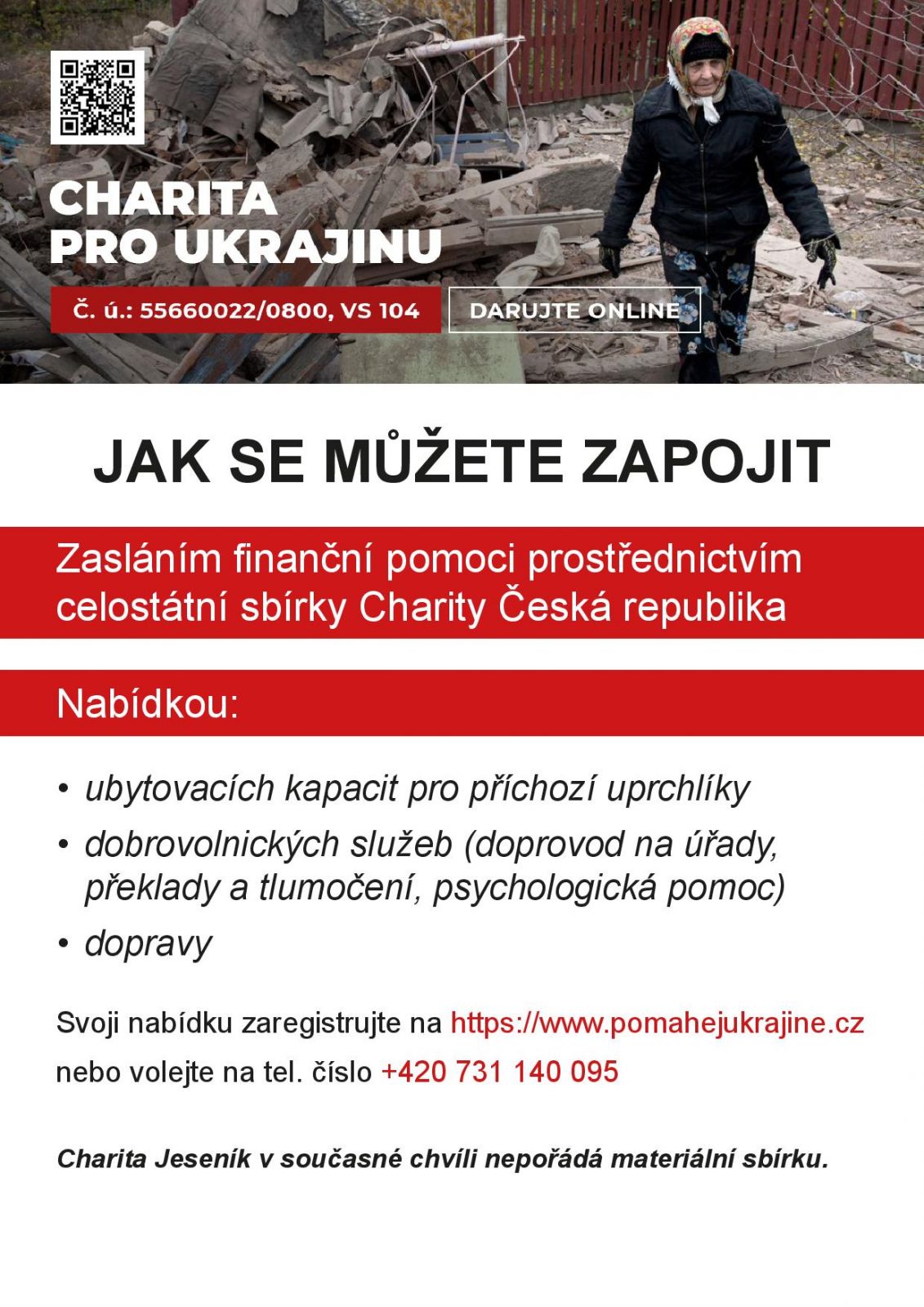 - Charita pro Ukrajinu Organizuje Charita Česká republika. Sbírkový účet: 55660022/0800, variabilní symbol 104. Dárcovské SMS na číslo 87 777: DMS CHARITASVET 30, DMS CHARITASVET 60 nebo DMS CHARITASVET 90