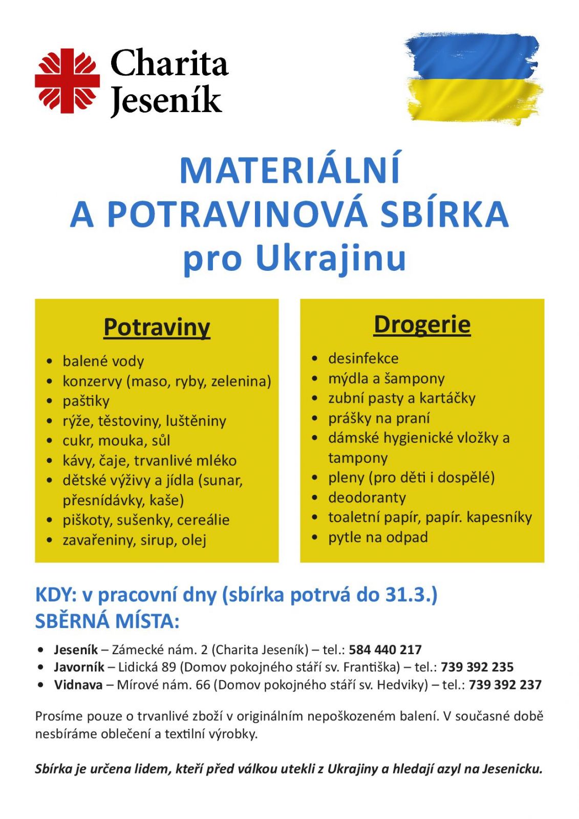 Aktuálně je vyhlášena materiální a potravinová sbírka, kterou pořádá Charita Jeseník. Sbírka je určena lidem, kteří před válkou utekli z Ukrajiny a hledají azyl na Jesenicku.