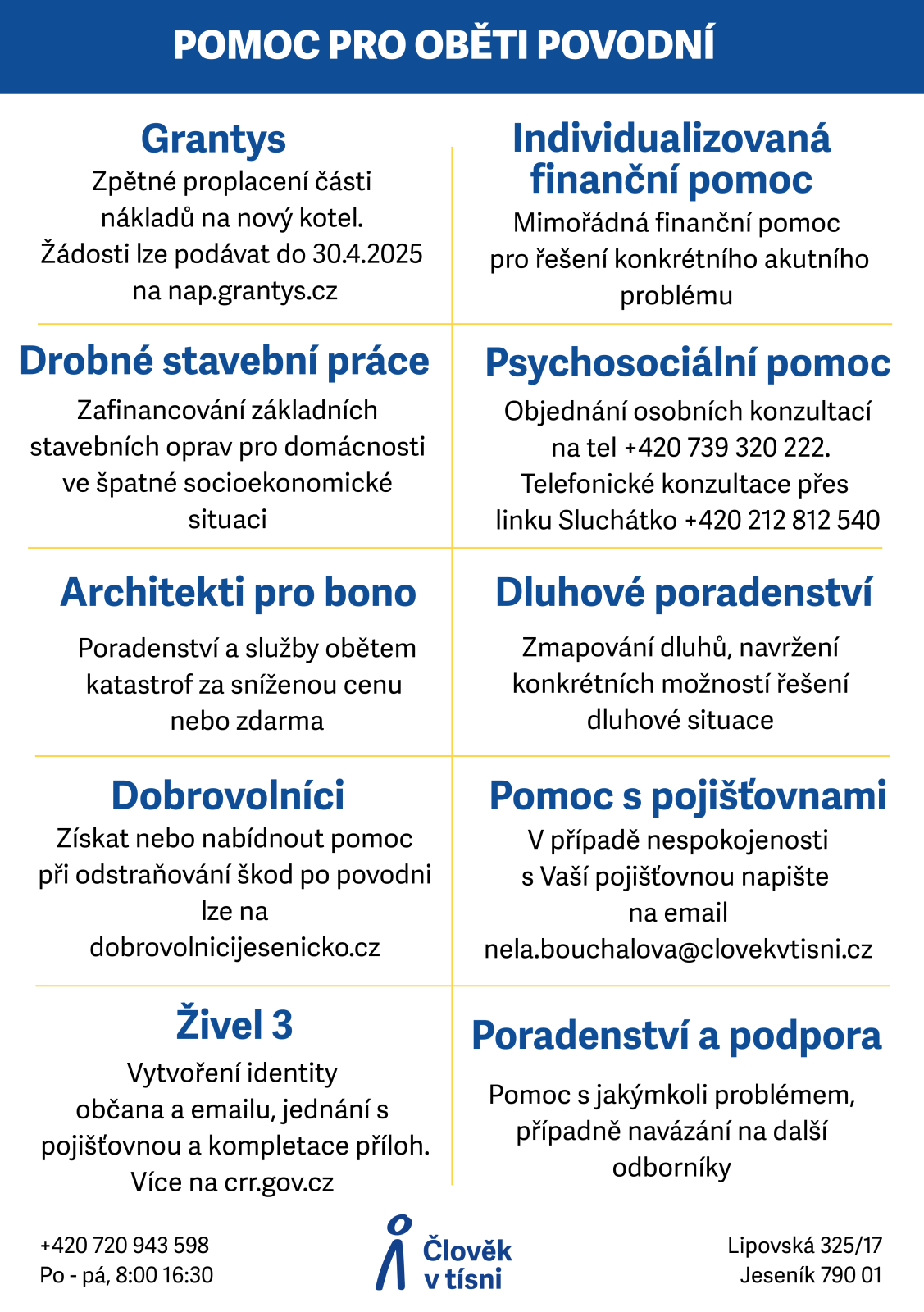 PŘEHLED POVODŇOVÉ POMOCIPřehled dotací, úvěrů, úlev, a další pomoci, kterou lze čerpat v souvislosti s následky povodní v září 2024 naleznete zde a níže v příloze. | ||||||||||||