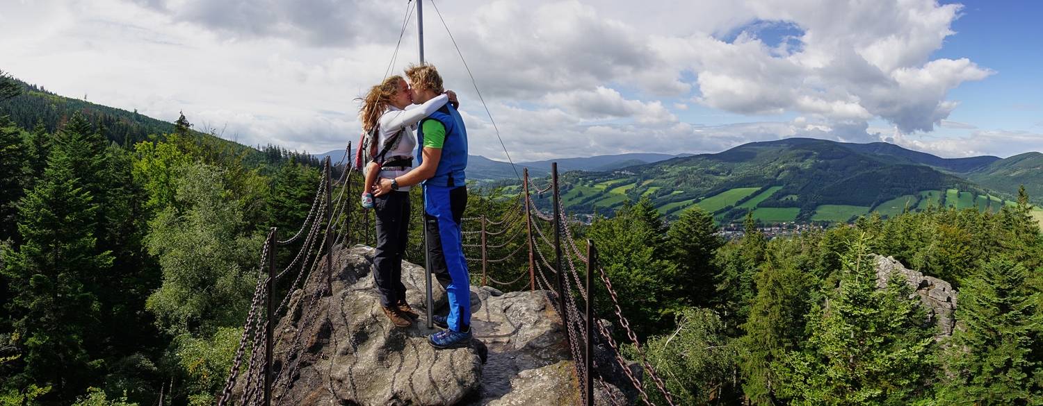 Čertovy kamenyČertovy kameny jsou skalní útvar nacházející se na severním úbočí Zlatého chlumu asi 3 km od Jeseníku. 40 m vysoký a 100 m dlouhý skalní útvar dal i jméno turistickému objektu, který byl vybudován v jeho těsné blízkosti na počátku 20. století. Zatímco český název skaliska Čertovy kameny je spjat s prastarou pověstí, vysvětlující vznik tohoto místa, je německý název Harichstein (Harichovy kameny) zcela prozaicky odvozen od jména majitele pozemku, na němž skála stála, německého sedláka z České Vsi Vinzenze Haricha. Výstup na vrcholek je zajištěn řetězy, z plošiny na vrcholku je pěkný pohled do údolí říčky Bělé, táhnoucí se od Jeseníku do Mikulovic a dále do polských rovin s výhledem až k Otmuchovskému jezeru.