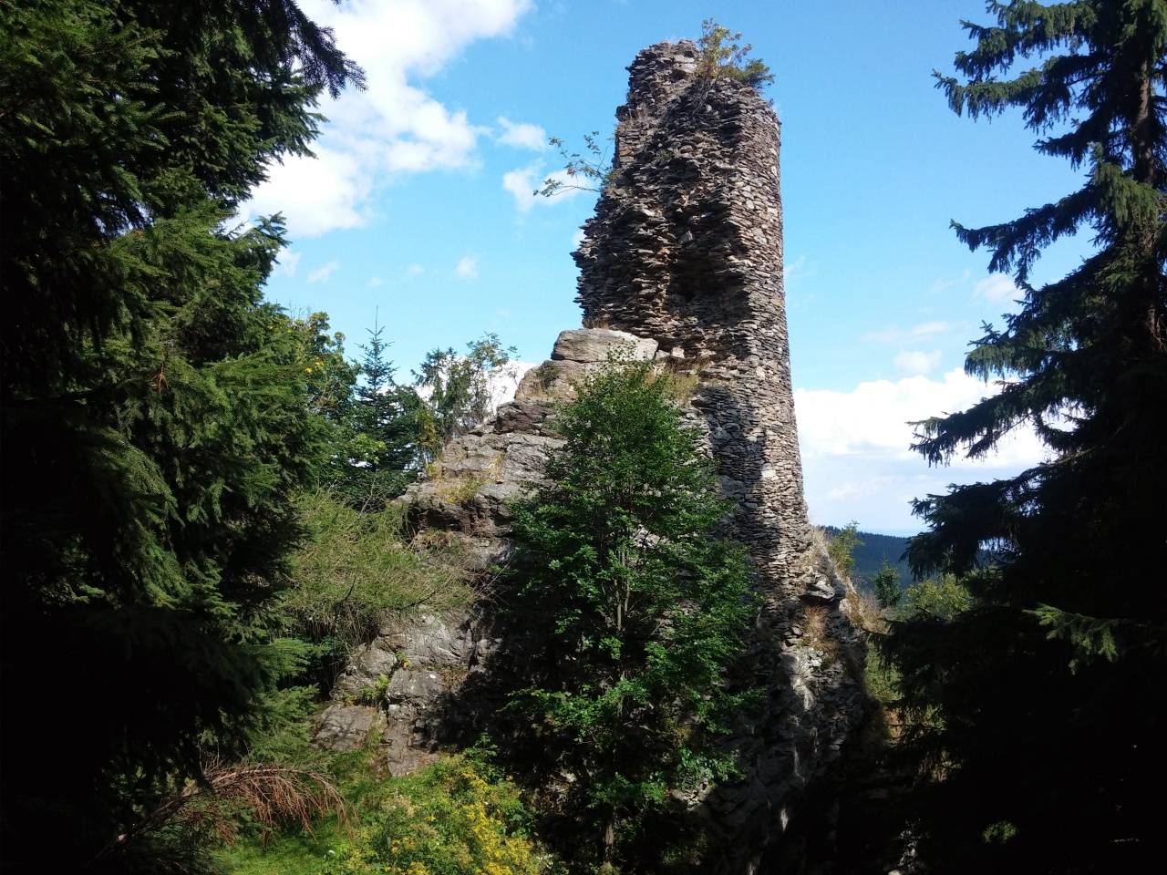 Zřícenina hradu KoberštejnPřekrásný výhled na Jeseníky nabízí hradní zřícenina, tyčící se nad přírodní rezervací Rejvíz. Tajemná zřícenina Koberštejna ční k obloze na Zámecké hoře v blízkosti města Zlaté Hory a národní přírodní rezervace Rejvíz. Písemné prameny z konce 17. století už uvádí hrad jako opuštěný a z jeho polohy a archeologických nálezů si tak můžeme jen domyslet, že sloužil ke střežení důležité obchodní stezky údolím Černé Opavy. Patrně kvůli značné odlehlosti a vysokým nákladům na provoz a údržbu se jeho majitelé později rozhodli nechat hrad na pospas zubu času. Podle jesenických pověstí a zkazek ještě počátkem 17. století obývala pusté hradní zdi banda loupežníků a hrdlořezů, která řádila v širokém okolí. Návštěva trosek Koberštejna vybízí milovníky turistiky i historie v Jeseníkách sice k trošku náročnější vycházce, Zámecká hora pak ale odmění vytrvalce jedním z nejkrásnějších výhledů na okolní jesenickou přírodu a kopce. Jako na dlani si odsud můžeme prohlédnout i proslulá rejvízská mechová jezírka, k nimž se také hned můžeme z kopce dolů vydat. Ke zřícenině Koberštejna vede z obce Rejvíz červená turistická značka, cesta je zakončená více než kilometrovým prudkým stoupáním. |