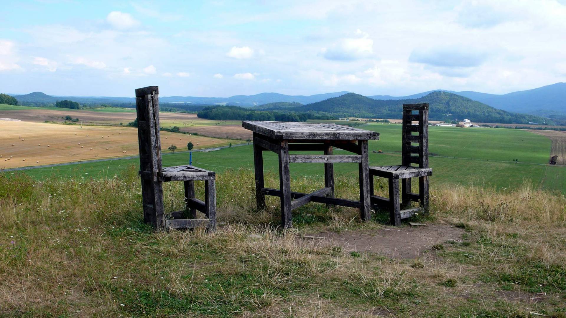 Obři stůl a židle na Sedmi LánechNa vrcholu Lánského vrchu v Rychlebských horách stojí v nadživotní velikosti stůl a dvě židle. Tato neobvyklá stavba je viditelná z dalekého okolí a zaujme každého na první pohled. Je dílem místních nadšenců. Odlesněné návrší nedaleko Skorošic u osady Sedm Lánů vedle silnice 60 z Jeseníku do Javorníku. Přes poměrně malou výšku poskytuje zajímavý kruhový výhled. Na jih a západ to jsou hlavně hřebeny Rychlebských hor. Severně pak na Žulovskou pahorkatinu. Přímo před sebou máme pak Kaní horu, vzdálenější je Smolný vrch (Venušiny misky). Na této hoře je pěkně vidět, proč se jí říká ostrovní hora. Na východě pak máme přímo dvojici ostrovních hor a to Boží horu a Borový vrch nad Žulovu, za kterými se zvedá masiv Studniční hory nad Jeseníkem (patří k Rychlebám) a tyto vrch ještě převyšují svahy Šeráku a Keprníku v Hrubém Jeseníku. |
