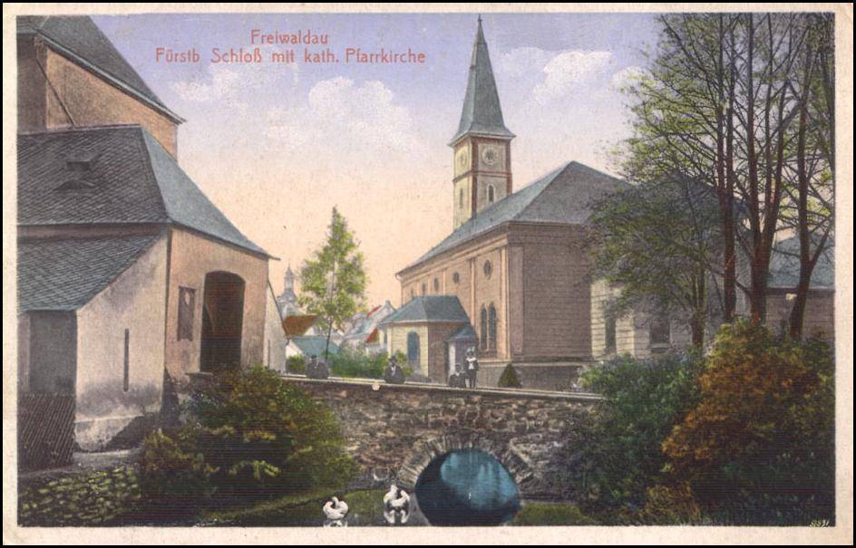 Z historie městaOd založení po období třicetileté válkyPrvní zmínka o lokalitě na místě dnešního Jeseníku pochází z roku 1267, kdy se v latinském pramenu cituje jako Vriwald (později Vrowald, Vrienwalde, Freynwalde), tedy místo zbavené lesa. Mezi lety 1284 a 1295 se stal městem. Jedním z důvodů byla strategická poloha na soutoku říček Staříče a Bělé, kde se rovněž cesta vedoucí ze Slezska na Moravu větvila k Ramzovskému a Červenohorskému sedlům. Toto místo již nejpozději roku 1284 střežil zdejší hrad, patřící vratislavskému biskupovi. Dalším důvodem byla naleziště železné rudy v okolí: z roku 1326 pochází první zmínka o zpracovávání železné rudy hned v třinácti hamrech poblíž Jeseníku. Jeseník spolu s vesnicemi v širším okolí tedy vznikl plánovitou kolonizací vratislavských biskupů, kteří zdejší území získali roku 1199. Součástí města byl od založení nepochybně i kostel s farou, ačkoli první zmínka o něm pochází z roku 1318. Stejně tak frývaldovský hrad musel jistě existovat již v roce 1284, kdy existoval "frývaldovský okruh" jako správní jednotka, výslovně se však zmiňuje až roku 1374. Jednalo se vlastně jen o vodní tvrz vybavenou - ještě koncem 17. století - padacím mostem. Ta existuje po několika přestavbách dosud a jako správní sídlo frývaldovského panství, později komplexu velkostatků, sloužila až do roku 1945. V roce 1295 se poprvé připomíná městské fojtství, k němuž patřil i dvůr a postupně i vesnice Ves Frývaldov, Česká Ves, Široký Brod a Bukovice. Od roku 1378 je drželi Mušínové. Počátkem 15. století to byl Hynek Mušín z Hohenštejnu (tj. dnešní Hoštejn), který se však stall příznivcem husitství, a biskup mu proto rychtu roku 1422 odňal a udělil je Hanuškovi Mušínovi, Hynkovu bratranci. Vdova po něm Anna prodala roku 1463 fojtský statek Hynčíkovi ze Šilperka, po jehož smrti (1468) je od vdovy Barbory odkoupil biskup. Fojtský statek byl pak i s městem Frývaldovem zastavován a samostatně se naposledy uvádí roku 1547. Město se brzy po založení hospodářsky rozvinulo. Již roku 1295 jsou připomínány první řemeslnické cechy, řeznický a pekařský. Z roku 1328 je první zmínka o těžbě a zpracování železa - tehdy povolil biskup Tomáš I. jakémusi Ludherovi postavit u města železný hamr. Ačkoli byla v 14. století železná ruda z Jeseníku prodávána až v Anglii, její těžba již koncem uvedeného století upadla a vylidnily se i hornické osady v okolí. Nový rozmach těžby železa, ale i stříbra a zlata, nastal v druhé polovině 15. století. V té době byl Jeseník s okolím udělován vratislavskými biskupy v léno. Za Jiřího z Poděbrad patřil Hynčíkovi ze Šilperka, od jehož vdovy jej biskup vykoupil roku 1468 a udělil dále roku 1478 Urbanu Stošovi, roku 1481 Baltazaru a Melicharovi z Močilnice, roku 1492 Pavlu Otweinovi, roku 1497 Linhartu Vogelovi. Významné bylo udělení Jeseniku i s okolním panstvím roku 1506 Fuggerům, celoevropsky působícímu podnikatelskému rodu z Augšpurku, kteří zde rozvinuli důlní činnost. Téhož roku získalo město horní privilegia a obdrželo erb. Ložiska však byla buď brzy vyčerpána, nebo se ukázala jako nevýnosná, a Fuggerové ztratili o panství zájem. Roku 1547 je vratislavský biskup Baltazar z Promnic odkoupil zpět a z Jeseníku bylo nadále spravováno okolní biskupské panství. Těžba železa zůstala v okolí města až do konce 18. století, ale ve značně redukované podobě. Naopak se ve městě rozvíjelo řemeslo, o čemž svědčí řada cechovních privilegií z přelomu 16. a 17. století. Za vlády Fuggerů se v Jeseníku prosadila reformace, přestože fara zůstávala pod patronátem biskupa, a teprve roku 1579 se zde podařilo dosadit opět katolického faráře (byť ženatého). 17. a 18. stoletíJako město ležící na významném vojenském tahu byl Jeseník v průběhu třicetileté války několikrát poškozen vojskem. V 17. století byl postižen i několika požáry, největším roku 1696. Přesto pokračoval hospodářský rozkvět města, zejména v textilních odvětvích (plátenictví), který byl ochromen až rozdělením Slezska roku 1742 a související ztrátou slezských trhů, dříve hlavního odběratele zdejší výroby. V té době rovněž město přišlo o horní právo a s tím spojené daňové výhody. Rekatolizace v městě i okolí proběhla bez potíží (roku 1651 nejsou registrováni žádní nekatolíci), zato bylo zdejší panství postiženo dlouhotrvající a intenzivní vlnou čarodějnických procesů. Od prvního v roce 1622 do posledního roku 1684 si procesy, iniciované jak zástupci biskupa, tak jesenickými měšťany, vyžádaly jen v samotném Jeseníku asi 102 obětí. Spolu s o něco později zahájenými procesy na Šumpersku a Velkolosinsku se jedná o nevýznamnější příklady "honu na čarodějnice" na území České republiky. V roce 1770 bylo v Jeseníku zřízeno římskokatolické arcikněžství, a to oddělením od arcikněžství Hlucholazy. To existuje v zásadě dosud, avšak roku 1946 bylo přeměněno na děkanát. V letech 1773-1794 byl biskupským hejtmanem na Frývaldově hudební skladatel Carl Ditters von Dittersdorf. 19. a 20. stoletíPo určitém útlumu zaznamenal Jeseník počátkem 19. století nový rozvoj, zejména průmyslový. Roku 1822 založil místní podnikatel Adolf Rayman továrnu (firma Regenhart u. Rayman) na jemné prádlo, která získala postavení na světových trzích a dominovala městskému hospodářství. Jeseník se tak stal významným průmyslovým centrem (a později i centrem dělnického hnutí). Toto postavení bylo na konci 19. století podtrženo napojením na významný železniční tah z Hanušovic do Hlucholaz (1888) a založení Blühdornovy továrny na ru