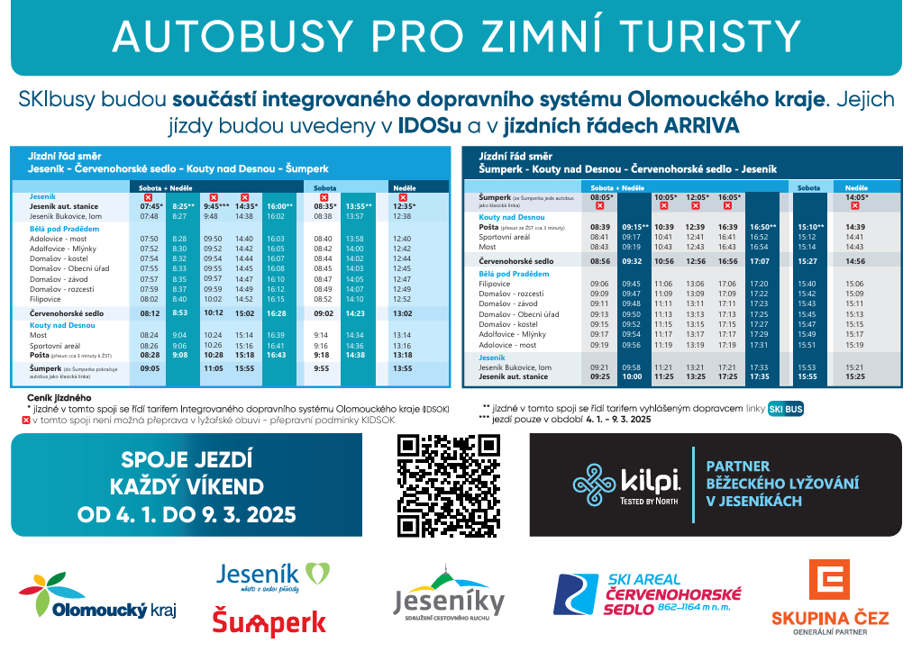 SKI BUS JESENÍKY 2025Ski busem můžete vyrazit do Filipovic, na Červenohorské sedlo či do Koutů z Jeseníku každou sobotu a neděli od 4. ledna do 9. března 2025 Máte chuť vyrazit na běžky a ochutnat jesenickou magistrálu, nebo okruhy na Červenohorském sedle anebo se vydat upravenou spojkou až na Dlouhé Stráně? Není nic jednoduššího než se mrknout na IDOS a vybrat si jeden ze spojů našeho skibusu. Skibus pojede každý víkend od 4.1.2025 až do 9.3.2025. Spoje navazují na příjezdy vlaků a ostatní spoje stejným směrem. Užijte si jedinečnou zimu v Jeseníkách. | ||||