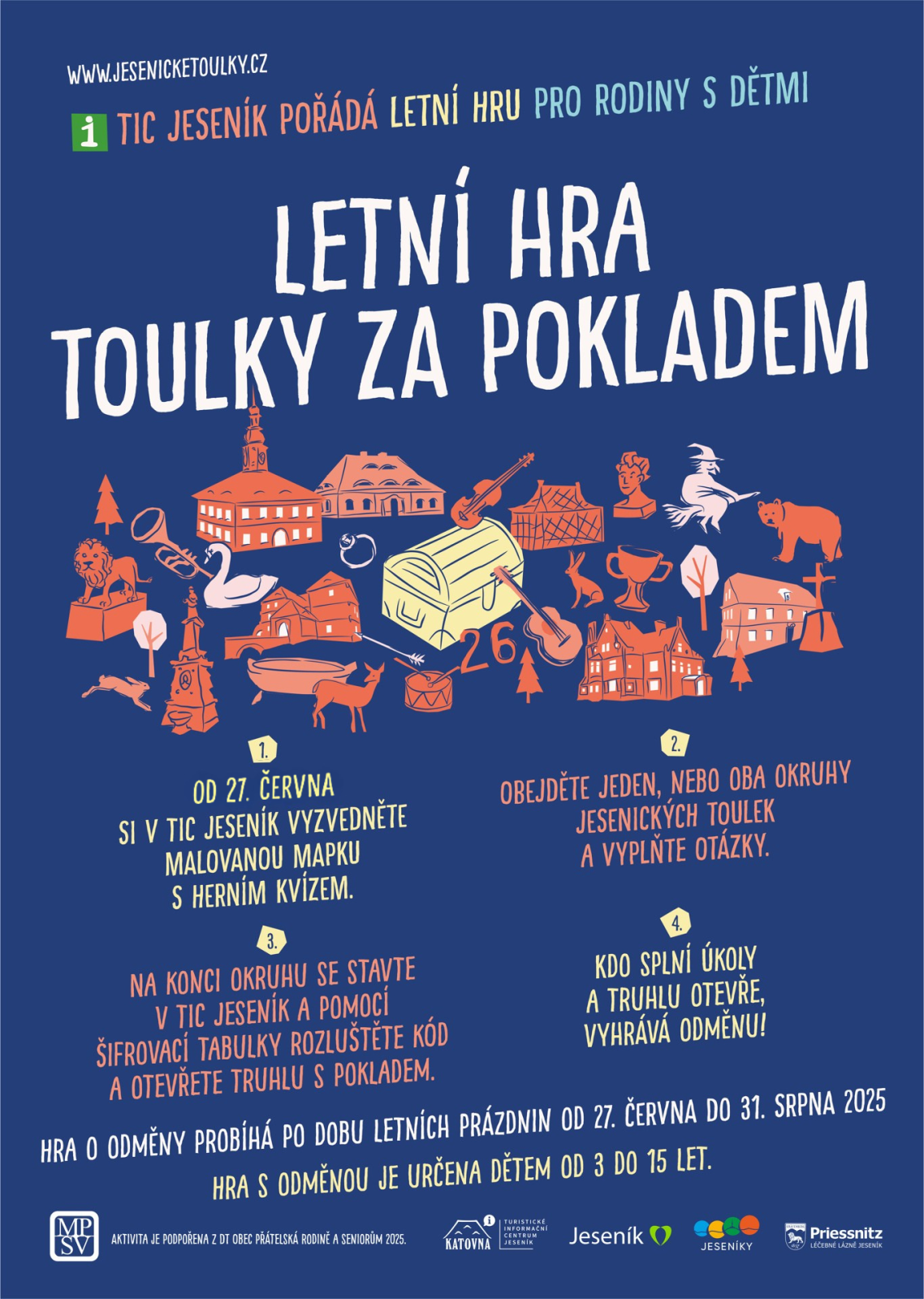 TOULKY ZA POKLADEM - LETNÍ HRA PRO DĚTI TIC JESENÍK pořádá letní hru pro rodiny s dětmi Pořádá TIC JESENÍK a město Jeseník www.jesenicketoulky.cz/letni-hra.htm Galerie