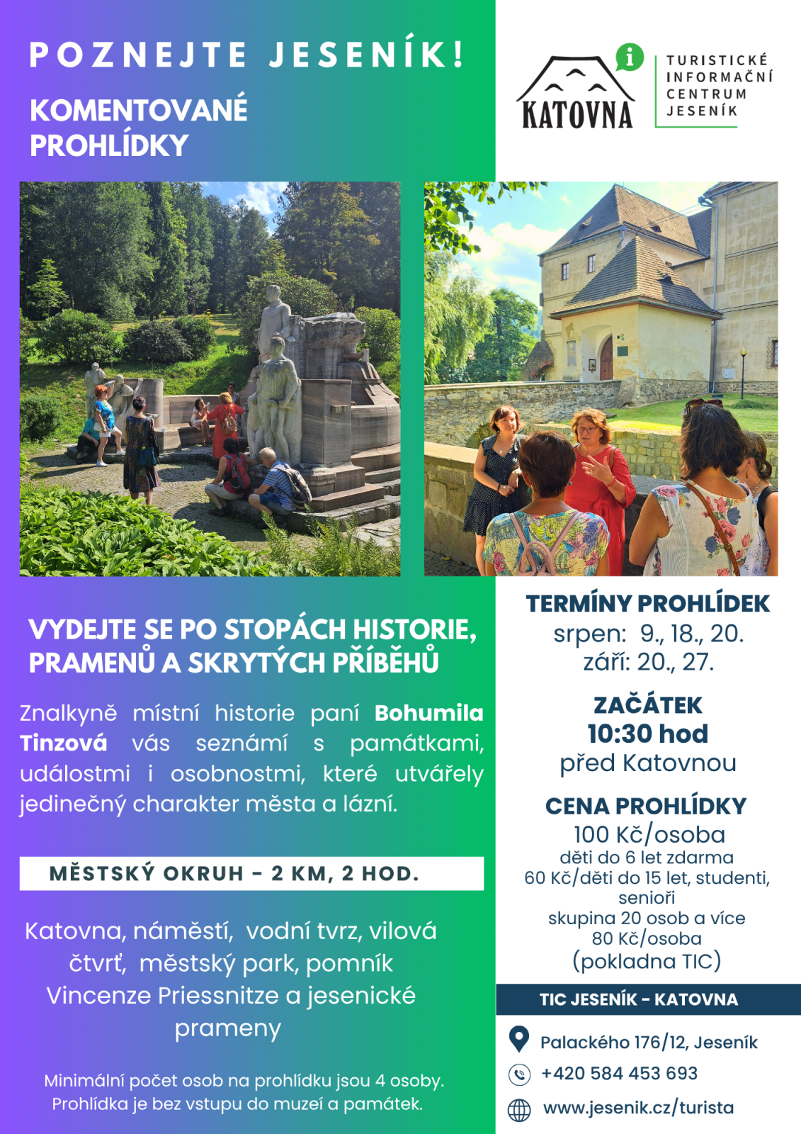 Znalkyně místní historie vás provede 2 km okruhem, během kterého (cca 1,5–2 hodiny) poznáte nejen významné památky, ale i příběhy osobností a událostí, které utvářely jedinečný charakter Jeseníku a místních lázní.